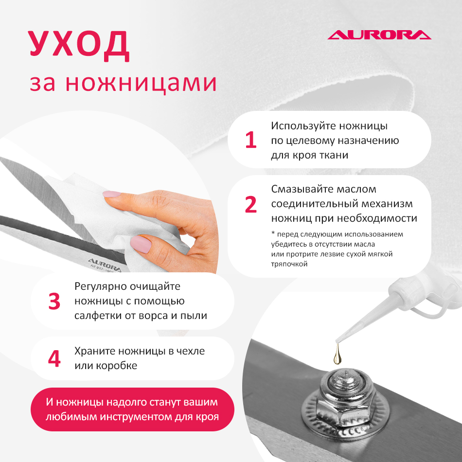 • Увеличенный угол наклона рукояти позволяет кроить ткань с минимальным отрывом от рабочей поверхности, обеспечивая прямой и точный разрез, а также облегчает работу с объемными и плотными материалами.• Острые кончики лезвий позволяют точно выполнять сложные выкройки, прорезать петли, работать с узкими деталями и делать точные надрезы.